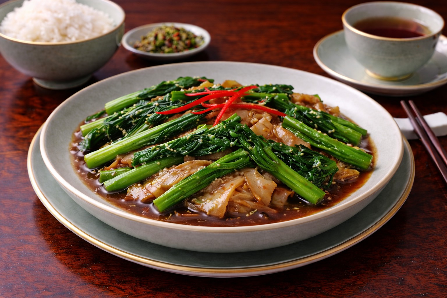 芥藍牛河粉是一道源自粵式茶餐廳與街頭小炒的經典河粉料理,在素食版本中以爽滑的河粉與清香微苦的芥藍為主角,呈現出清爽卻不失鍋氣的風味。河粉柔軟順滑,能夠很好地吸附醬香,而芥藍在快火翻炒後依然保持脆嫩口感,略帶回甘,恰好中和河粉的厚實感,使整體口味清爽平衡。透過高溫快炒,河粉表面略帶焦香,形成粵式炒粉特有的香氣。